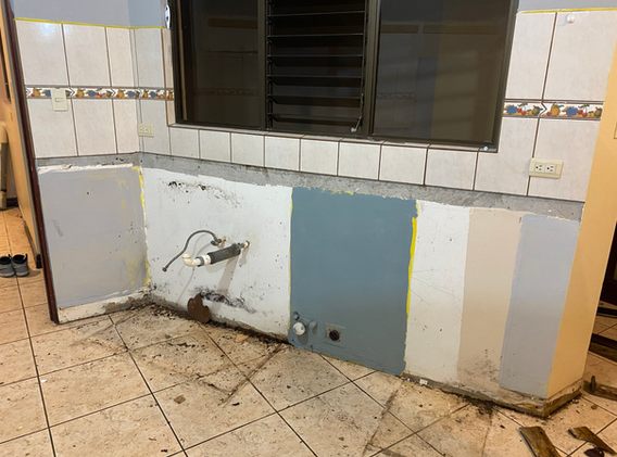 Tuvimos que remover todo el rodapié y cambiar los muebles de cocina porque estaban podridos, además sellamos los huecos en paredes y reparamos la sección inferior de la pared para poner un nuevo rodapié en PVC.